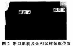 汽車板簧卷耳斷面,不同部位的斷口特征不同,因此對不同部位分別進行力學(xué)性能檢測。在下圖所示斷口分別取截面A、B在橫截面上打硬度。結(jié)果如下: