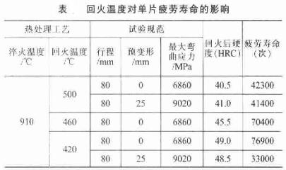 上表表面,汽車板簧在較低應(yīng)力幅度(6860Mpa)下,強(qiáng)度越高,疲勞壽命越長。在較高應(yīng)力幅度(9020MPa)時,需要較好的強(qiáng)韌配合,但回火溫度也不應(yīng)超過460℃。